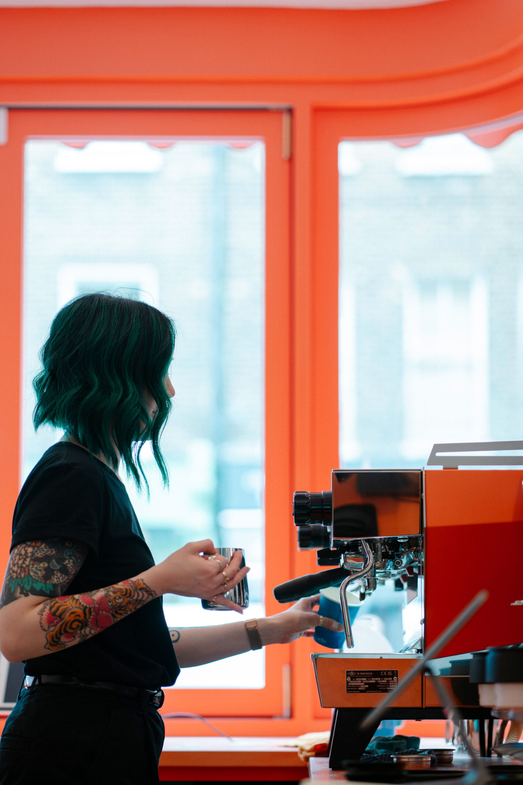 The bright coral-fluted façade treatment curving around the shopfront and an undulating awning make sure Cona stands out on the street. The serving counter starts from the outside, drawing customers through the space while an intricately designed servery window folds open to engage the surrounding streetscape, attracting valuable passing trade.