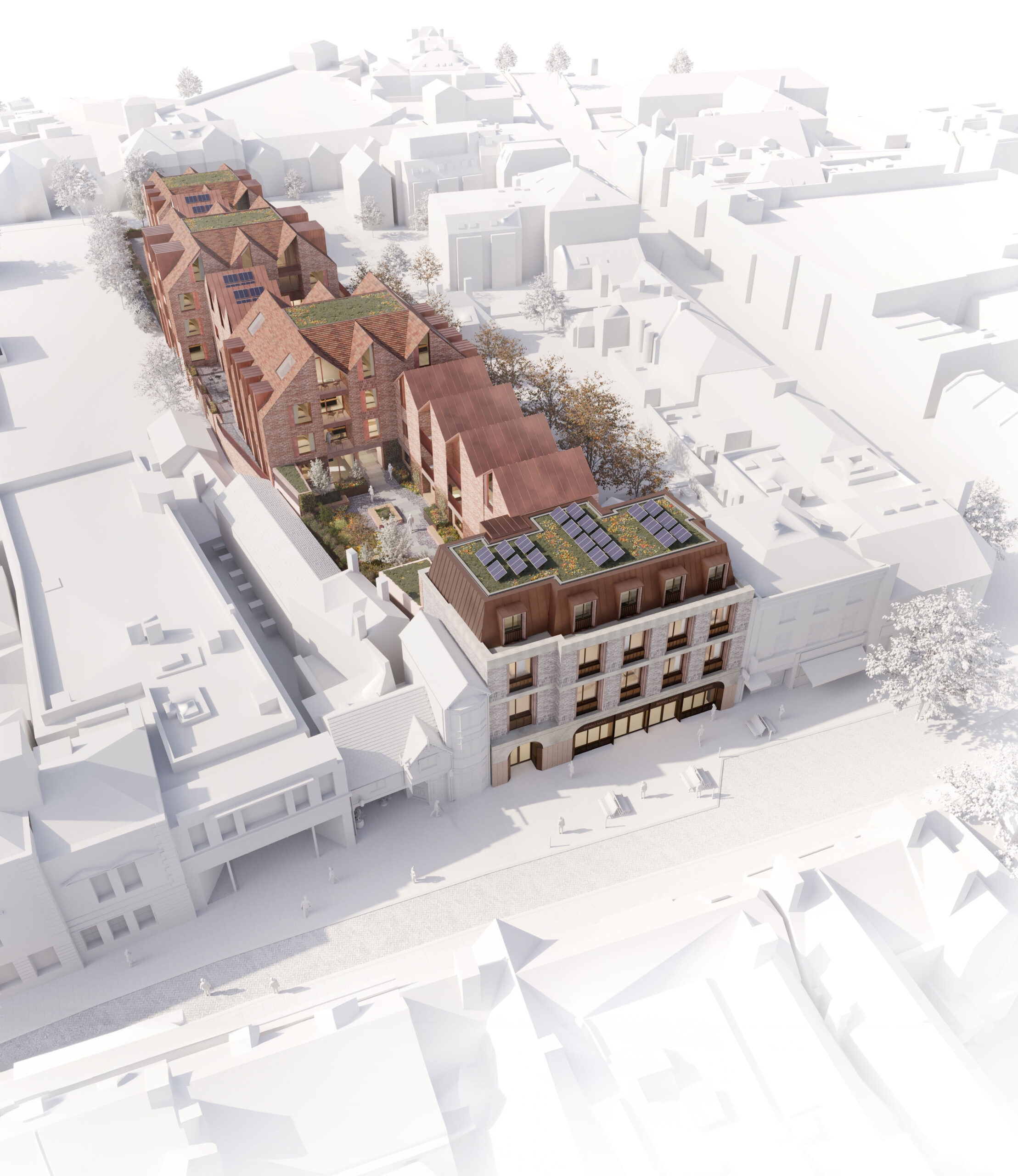 Comprising a total of 44 new apartments and a contemporary high street building, the project aims to provide high-quality, modern apartments while preserving the historic market town’s character. This is achieved through an architectural design that arranges residential blocks around three inner courtyards, reflecting the historical presence of courtyards.