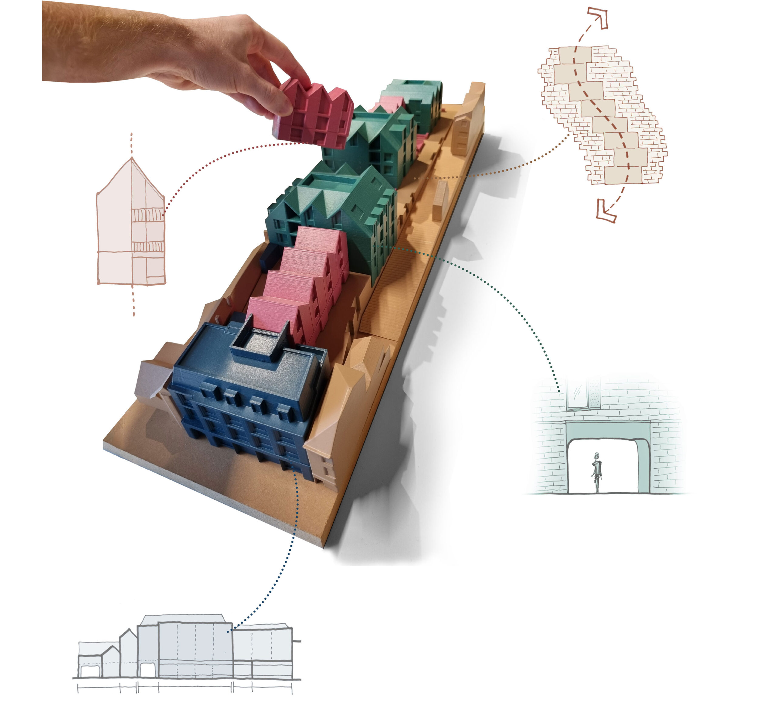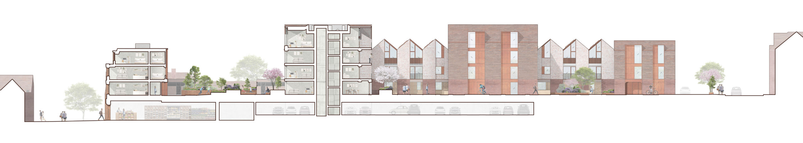 Our goal was to reimagine this complex site to create a new sense of urbanism in the town centre, centred around the needs of residents and users. At the heart of the design is a series of courtyards, surrounded by homes and pedestrian gardens